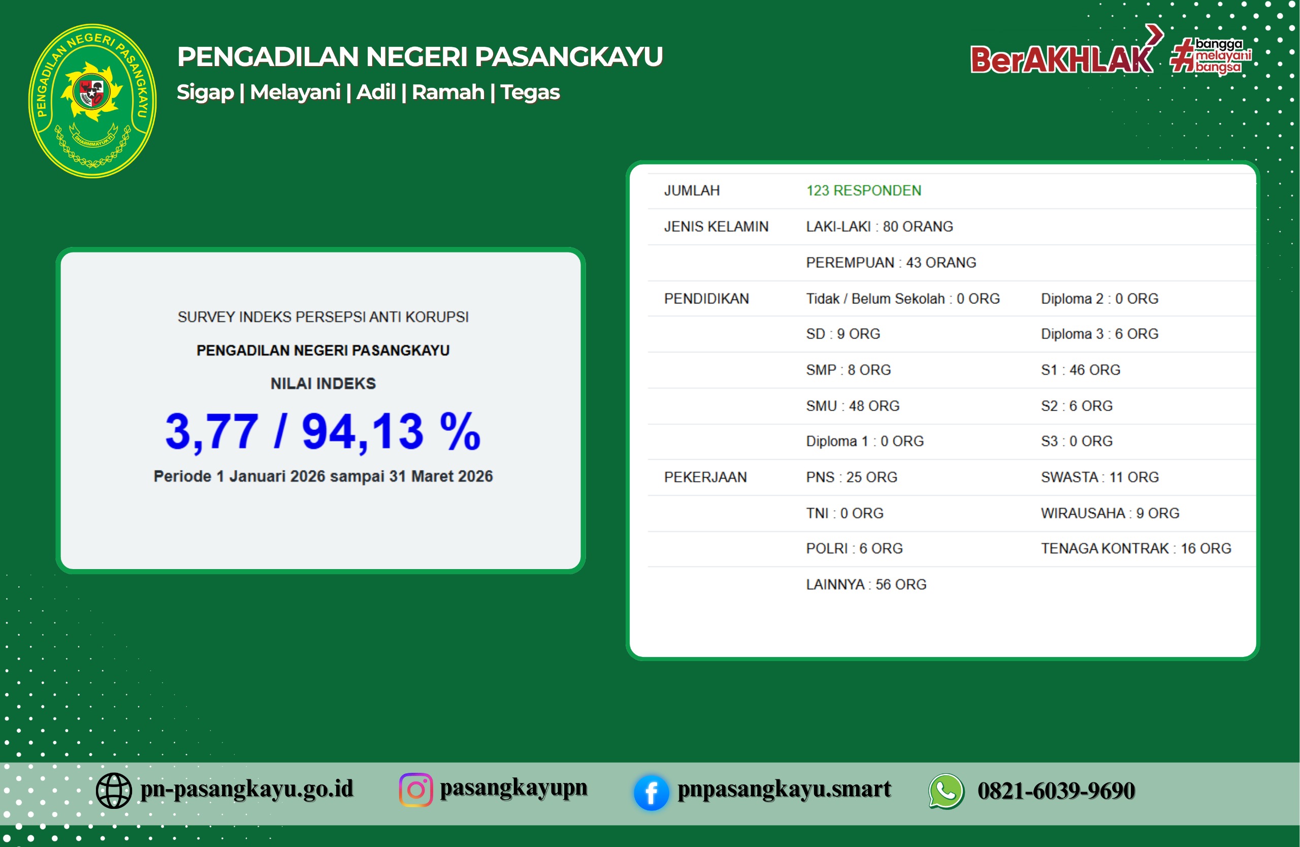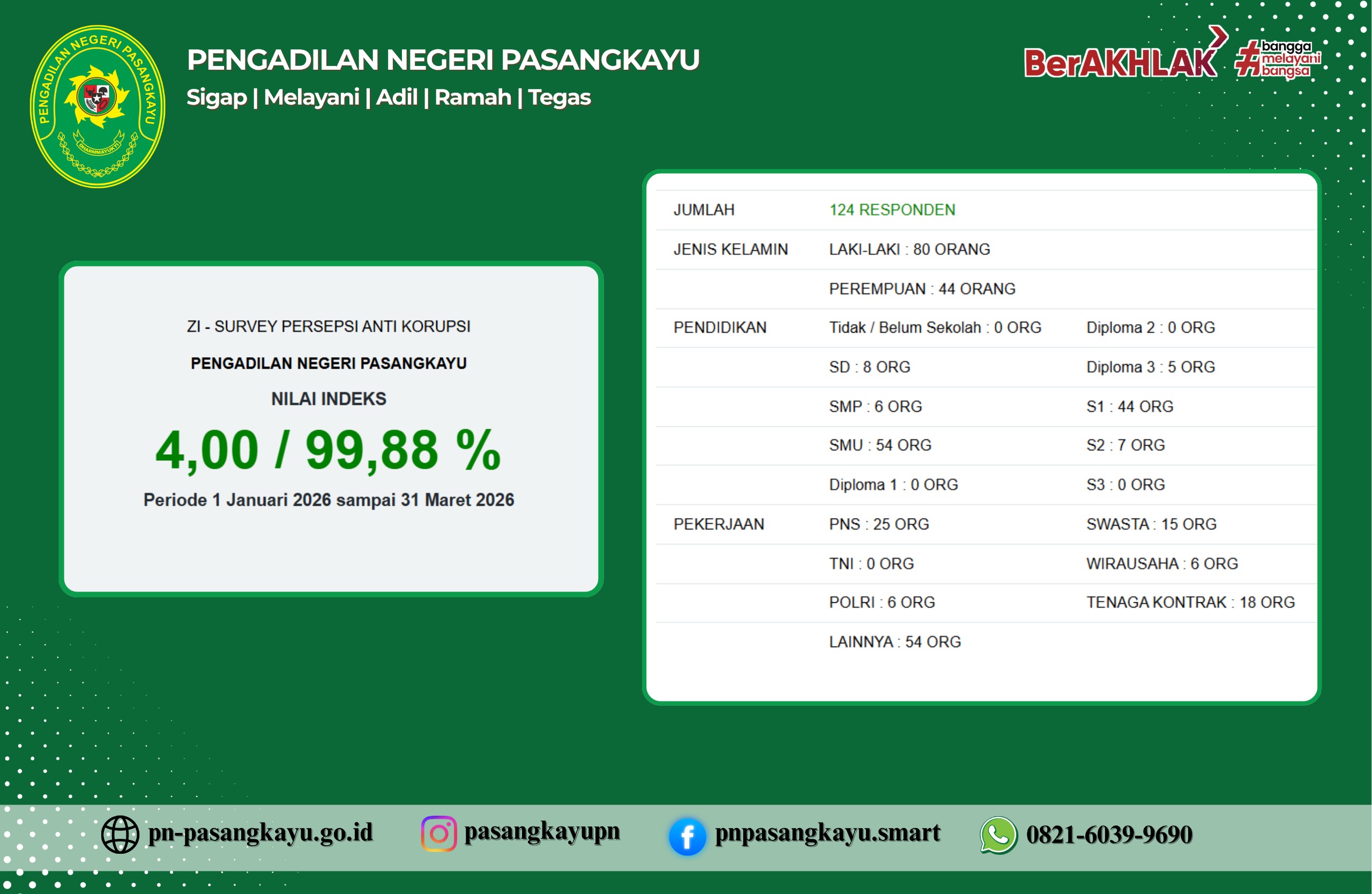Mahkamah Agung RI telah merilis Sistem Informasi Penelusuran Perkara/Case Tracking System (SIPP/CTS) Pengadilan Tinggi. Aplikasi ini berisi informasi dan statistik perkara Pengadilan Negeri Pasangkayu.
